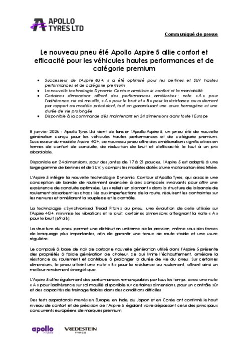 Apollo Tyres Ltd vient de lancer l'Apollo Aspire 5, un pneu été de nouvelle génération conçu pour les véhicules hautes performances et de catégorie premium qui offre des améliorations significatives en termes de confort de conduite, de réduction de bruit et d'efficacité, le tout à un prix abordable.