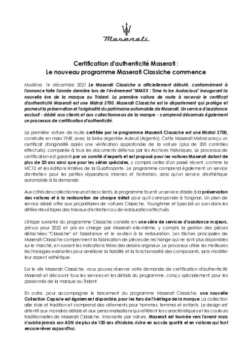 Conformément à l'annonce faite l'année dernière lors de l'événement "MMXX : Time to be Audacious", le Maserati Classiche a officiellement débuté. La première voiture de route à recevoir le certificat d'authenticité Maserati est une Mistral 3700. Maserati Classiche est le département qui protège et promeut la préservation et l'originalité du patrimoine automobile de Maserati. Un service d'assistance exclusif - dédié aux clients et aux collectionneurs de la marque...