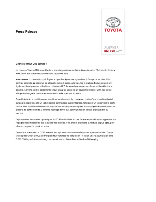 Le nouveau Toyota GT86 sera dévoilé la semaine prochaine au Salon International de l’Automobile de New York, avant son lancement commercial à l’automne 2016. Le coupé sportif Toyota adopte des lignes plus agressives, à l’image de sa prise d’air centrale agrandie qui accentue sa silhouette large et basse. À l’avant, les retouches de style concernent également les clignotants et les blocs optiques à LED, le nouvel entourage des phares antibrouillard et le bouclier.