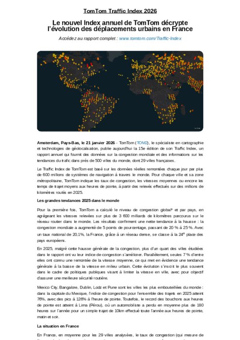 TomTom (TOM2), le spécialiste en cartographie et technologies de géolocalisation, publie aujourd'hui la 15e édition de son Traffic Index, un rapport annuel qui fournit des données sur la congestion mondiale et des informations sur les tendances du trafic dans près de 500 villes du monde, dont 29 villes françaises.