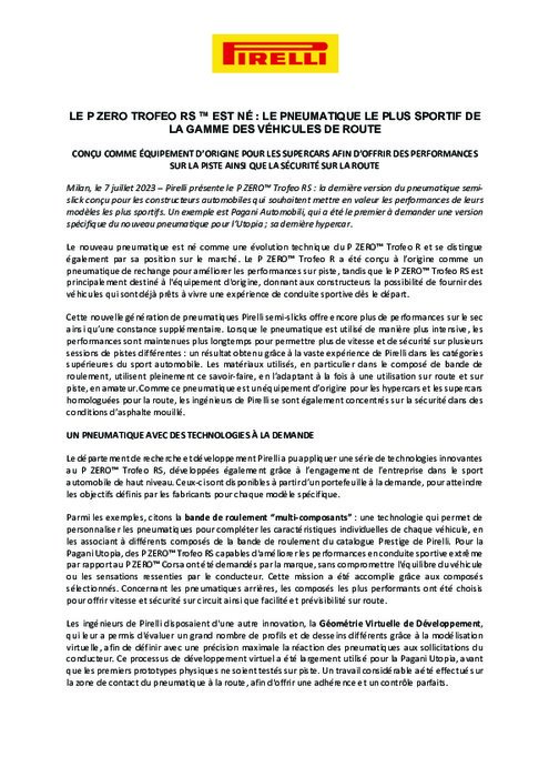 Pirelli présente le P ZERO Trofeo RS : la dernière version du pneumatique semislick conçu pour les constructeurs automobiles qui souhaitent mettre en valeur les performances de leurs modèles les plus sportifs. Un exemple est Pagani Automobili, qui a été le premier à demander une version spécifique du nouveau pneumatique pour l’Utopia ; sa dernière hypercar. Le nouveau pneumatique est né comme une évolution technique du P ZERO Trofeo R et se distingue également par sa position sur le marché.