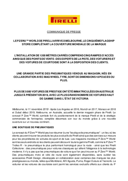 Après Los Angeles en 2016, Munich en 2017, Monaco en 2018 et Dubaï début 2019, Melbourne, en Australie, accueille le dernier magasin phare de Pirelli. Le concept P Zéro World, symbole fort du positionnement de la marque Pirelli et de la stratégie commerciale de l'entreprise, complète désormais son tour du monde grâce à une nouvelle ouverture sur un nouveau continent.