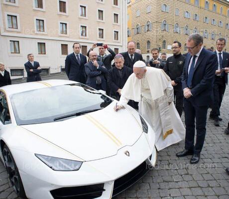 Le souverain pontife a béni la voiture de sport "Lamborghini Huracan" et apposé sa signature sur le capot, en présence de dirigeants du constructeur automobile venu livrer le modèle au Vatican.