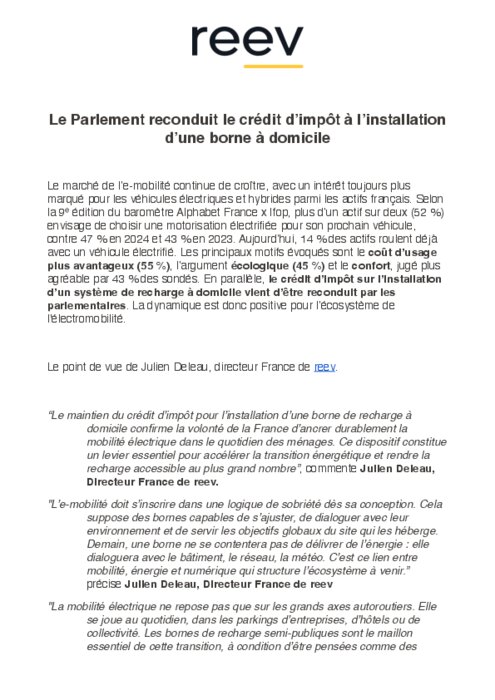 Le marché de l’e-mobilité continue de croître, avec un intérêt toujours plus marqué pour les véhicules électriques et hybrides parmi les actifs français. Selon la 9ᵉ édition du baromètre Alphabet France x Ifop, plus d’un actif sur deux (52 %) envisage de choisir une motorisation électrifiée pour son prochain véhicule, contre 47 % en 2024 et 43 % en 2023. Aujourd’hui, 14 % des actifs roulent déjà avec un véhicule électrifié. Les principaux motifs évoqués sont le coût d’usage plus avantageux (55 %), l’argument écologique (45 %)et le confort, jugé plus agréable par 43 % des sondés. En parallèle,le crédit d’impôt sur l’installation d’un système de recharge à domicile vient d’être reconduit par les parlementaires. La dynamique est donc positive pour l’écosystème de l'électromobilité.