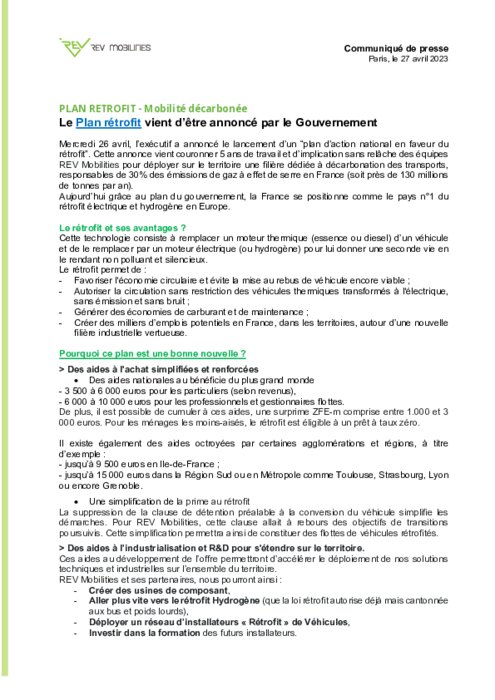 Mercredi 26 avril, l’exécutif a annoncé le lancement d’un “plan d’action national en faveur du rétrofit”. Cette annonce vient couronner 5 ans de travail et d’implication sans relâche des équipes REV Mobilities pour déployer sur le territoire une filière dédiée à décarbonation des transports, responsables de 30% des émissions de gaz à effet de serre en France (soit près de 130 millions de tonnes par an).