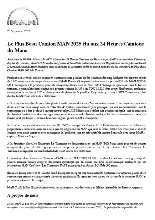 Avec plus de 80 000 visiteurs, la 40e édition des 24 Heures Camions du Mans n’a pas failli à la tradition. Courses et défilés de camions, stand MAN, ambiance festive et familiale ont animé le circuit Bugatti tout au long du week-end. L’occasion surtout, après plusieurs mois de suspens de connaitre enfin le grand gagnant du jeu-concours du Plus Beau Camion MAN 2025 de France.