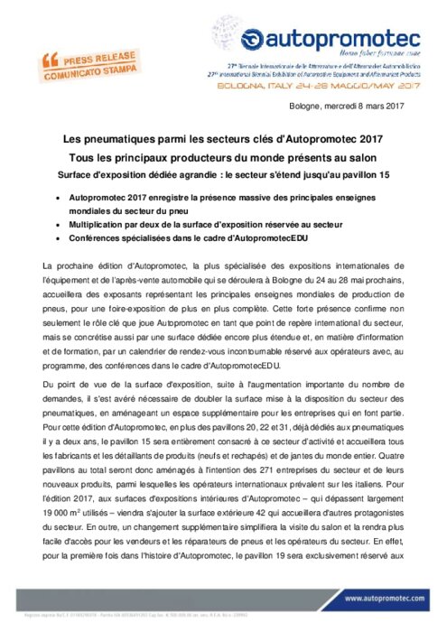 La prochaine édition d'Autopromotec, la plus spécialisée des expositions internationales de l’équipement et de l’après-vente automobile qui se déroulera à Bologne du 24 au 28 mai prochains, accueillera des exposants représentant les principales enseignes mondiales de production de pneus, pour une foire-exposition de plus en plus complète. Cette forte présence confirme le rôle clé que joue Autopromotec en tant que point de repère international du secteur.