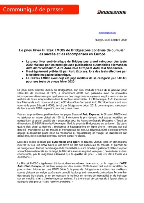 Le pneu hiver emblématique de Bridgestone grand vainqueur des tests 2020 réalisés par les prestigieuses publications automobiles allemandes auto motor und sport, ACE Auto Club Europa et Auto Bild Sportscars. Il est également plébiscité par Auto Express, lors des tests effectués par le célèbre magazine britannique. Le Blizzak LM005 avait déjà été jugé meilleur de sa catégorie par l’ADAC pour ses tests de pneus hiver 2020.