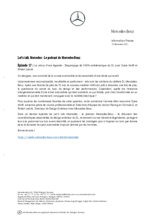Constructeurs 21 décembre 2021 - 10:15 Pour cet épisode 17, Mercedes propose Le retour d’une légende - Séquençage de l'ADN emblématique du SL avec Susie Wolff et Robert Lesnik. PDF (132 Ko) Télécharger