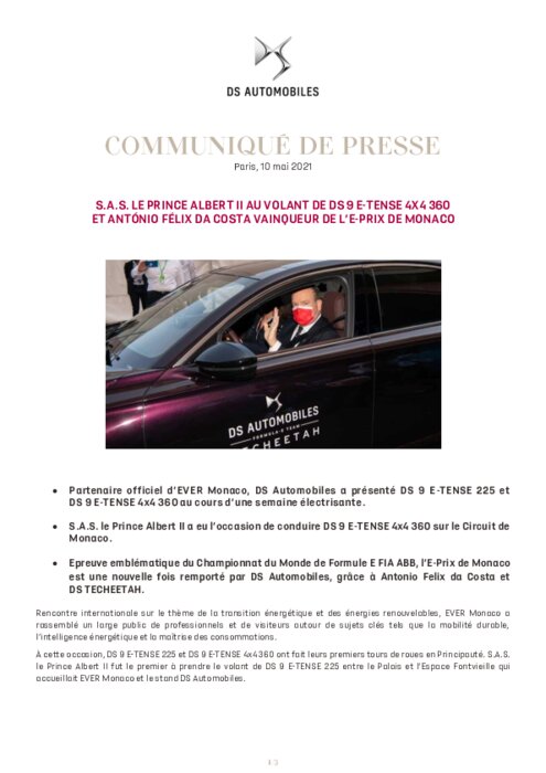 DS 9 E-TENSE 225 et DS 9 E-TENSE 4x4 360 ont fait leurs premiers tours de roues en Principauté. S.A.S. le Prince Albert II fut le premier à prendre le volant de DS 9 E-TENSE 225 entre le Palais et l’Espace Fontvieille qui accueillait EVER Monaco et le stand DS Automobiles.