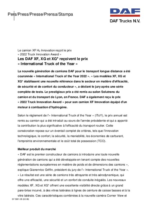 La nouvelle génération de camions DAF pour le transport longue distance a été couronnée « International Truck of the Year 2022 ». « Les modèles XF, XG et XG⁺ établissent une nouvelle référence dans le secteur en matière d'efficacité, de sécurité et de confort du conducteur », a déclaré le jury après une série complète de tests. Le prestigieux prix a été remis au salon Solutrans du camion et du transport de Lyon, en France. DAF a également reçu le prix « 2022 Truck Innovation Award »...