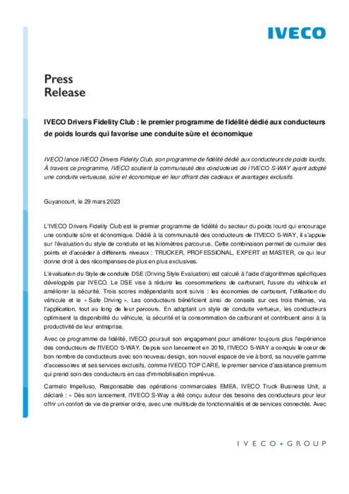 IVECO lance IVECO Drivers Fidelity Club, son programme de fidélité dédié aux conducteurs de poids lourds. À travers ce programme, IVECO soutient la communauté des conducteurs de l’IVECO S-WAY ayant adopté une conduite vertueuse, sûre et économique en leur offrant des cadeaux et avantages exclusifs.