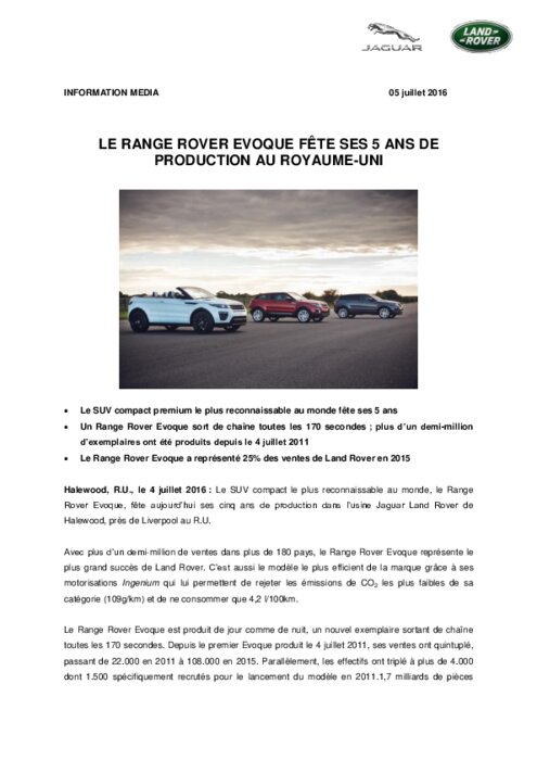 Le SUV compact le plus reconnaissable au monde, le Range Rover Evoque, fête mardi 5 juillet 2016 ses cinq ans de production dans l’usine Jaguar Land Rover de Halewood, près de Liverpool au R.U. Avec plus d’un demi-million de ventes dans plus de 180 pays, le Range Rover Evoque représente le plus grand succès de Land Rover. C’est aussi le modèle le plus efficient de la marque grâce à ses motorisations Ingenium qui lui permettent de rejeter les émissions de CO2 les plus faibles de sa catégorie.