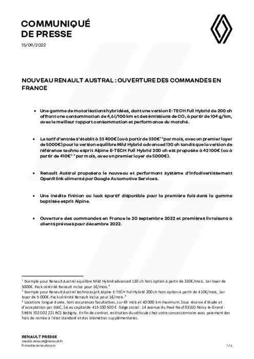 Proposé en pré-commande depuis le 30 juin, Nouveau Renault Austral sera disponible à la commande dès le 20 septembre dans le réseau Renault en France, ainsi que sur renault.fr, pour des livraisons à partir de décembre 2022. Les clients ayant pré-commandé leur véhicule se verront proposer de confirmer leur commande afin d’être parmi les premiers clients livrés.