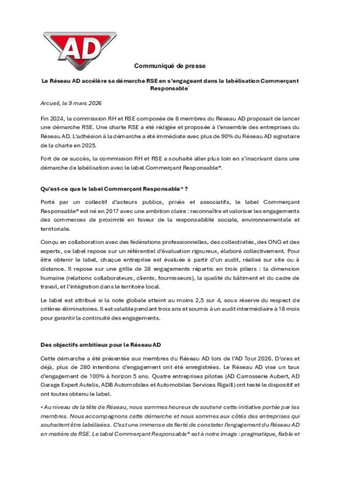 Fin 2024, la commission RH et RSE composée de 8 membres du Réseau AD proposait de lancer une démarche RSE. Une charte RSE a été rédigée et proposée à l’ensemble des entreprises du Réseau AD. L’adhésion à la démarche a été immédiate avec plus de 90% du Réseau AD signataire de la charte en 2025.