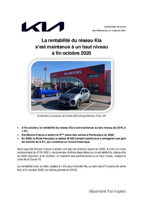Alors que Kia Motors France a atteint une part de marché record en 2020, à 2,4%, les premiers chiffres disponibles sur la rentabilité du réseau Kia en 2020 montrent, à fin octobre, un maintien des performances à un haut niveau, malgré la crise de la Covid-19. La rentabilité s’est, en effet, établie à 1,4% pour l’activité Kia, au sein des 217 points de vente Kia, à fin octobre 2020.
