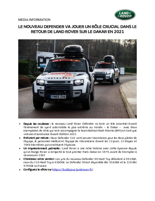 Le plus efficace et le plus résistant des Land Rover relève ce qui constitue l'ultime défi en matière de tout-terrain, avec deux Defender 110 d'assistance sur le Dakar 2021. Ce rallye est l'une des plus redoutables épreuves sportives au monde et deux exemplaires de série vont assurer l'assistance du team Bahrain Raid Xtreme (BRX), l'équipe structurée par Prodrive, tout au long des 7646 kilomètres du prochain Dakar.