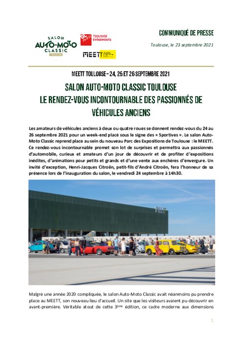 Les amateurs de véhicules anciens à deux ou quatre roues se donnent rendez-vous du 24 au 26 septembre 2021 pour un week-end placé sous le signe des « Sportives ». Le salon Auto-Moto Classic reprend place au sein du nouveau Parc des Expositions de Toulouse : le MEETT.