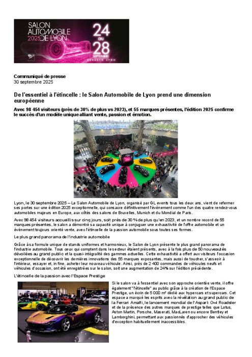 Le Salon Automobile de Lyon, organisé par GL events tous les deux ans, vient de refermer ses portes sur une édition 2025 exceptionnelle, qui consacre définitivement l'événement comme l'un des quatre rendez-vous automobiles majeurs en Europe, aux côtés des salons de Bruxelles, Munich et du Mondial de Paris. Avec 98 454visiteurs accueillis sur cinq jours, soit près de 30% de plus qu’en 2023,et un nombre record de 55 marques présentes, le salon a démontré sa capacité unique à conjuguer une exhaustivité de l'offre automobile et un événement toujours orienté vente, avec l'étincelle de la passion automobile sous toutes ses formes.