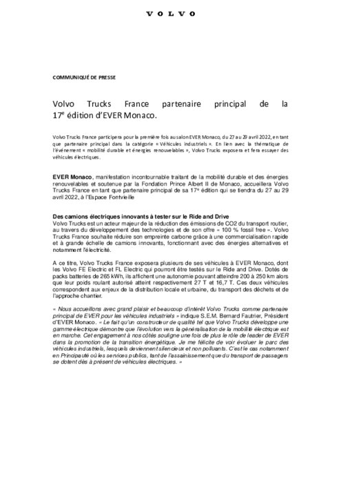 Volvo Trucks France participera pour la première fois au salon EVER Monaco, du 27 au 29 avril 2022, en tant que partenaire principal dans la catégorie « Véhicules industriels ». En lien avec la thématique de l’événement « mobilité durable et énergies renouvelables », Volvo Trucks exposera et fera essayer des véhicules électriques.