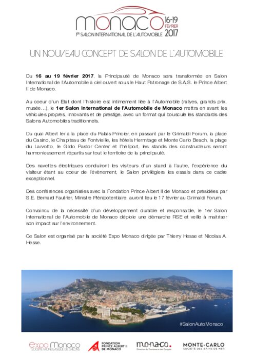 Services 15 février 2017 - 16:53 Du 16 au 19 février 2017, la Principauté de Monaco sera transformée en Salon International de l’Automobile à ciel ouvert sous le Haut Patronage de S.A.S. le Prince Albert II de Monaco. PDF (266 Ko) Télécharger