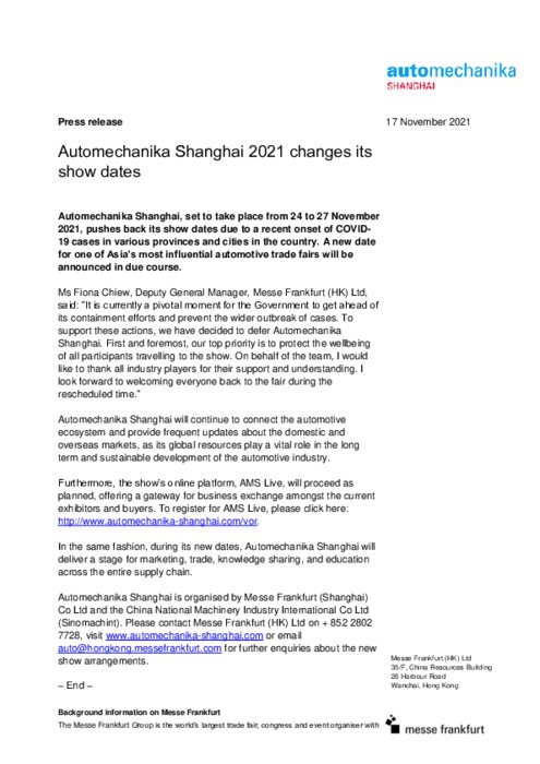 Services 17 novembre 2021 - 11:08 Le salon physique Automechanika Shanghai 2021, www.automechanika-shanghai.com, sera reporté en raison de la situation sanitaire en Chine. Les nouvelles dates seront communiquées ultérieurement. Voir le communiqué détaillé ci-dessous (en anglais) PDF (215 Ko) Télécharger