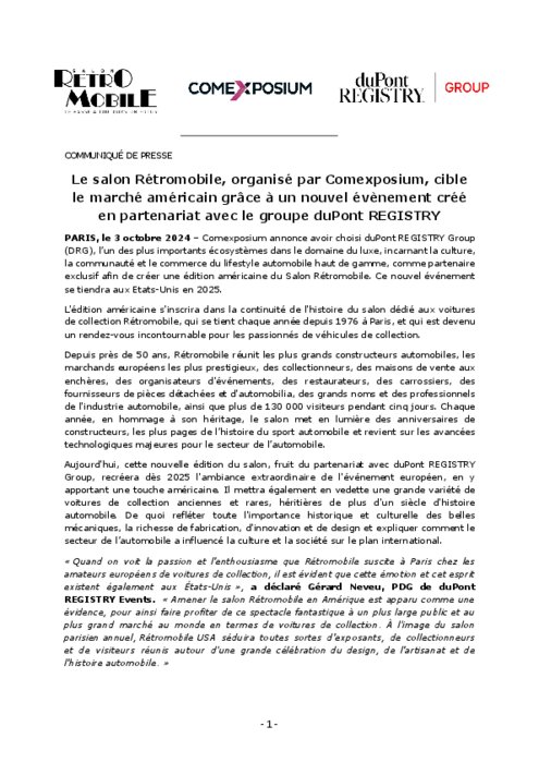 Comexposium annonce avoir choisi DuPont Registry Group (DRG), l’un des plus importants écosystèmes dans le domaine du luxe, incarnant la culture, la communauté et le commerce du lifestyle automobile haut de gamme, comme partenaire exclusif afin de créer une édition américaine du Salon Rétromobile. Ce nouvel événement se tiendra aux Etats-Unis en 2025.