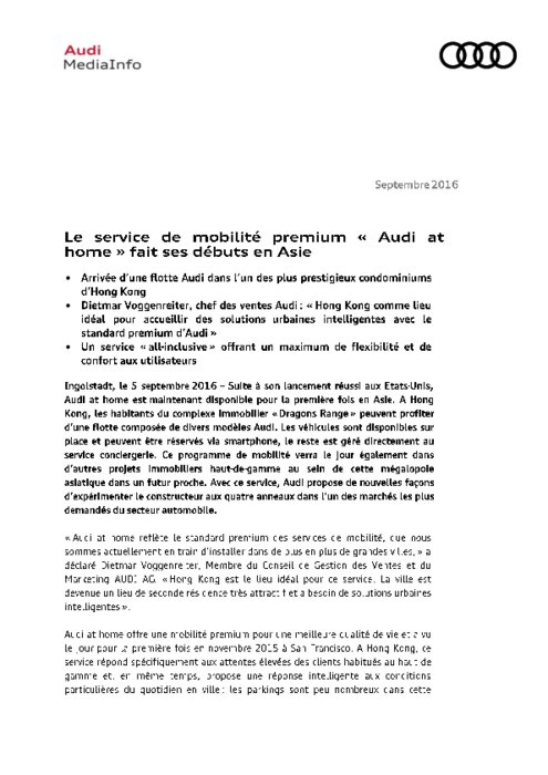 Suite à son lancement réussi aux Etats-Unis, Audi at home est maintenant disponible pour la première fois en Asie. A Hong Kong, les habitants du complexe immobilier « Dragons Range » peuvent profiter d’une flotte composée de divers modèles Audi. Les véhicules sont disponibles sur place et peuvent être réservés via smartphone, le reste est géré directement au service conciergerie. Ce programme de mobilité verra le jour également dans d’autres projets immobiliers haut-de-gamme de la même ville.