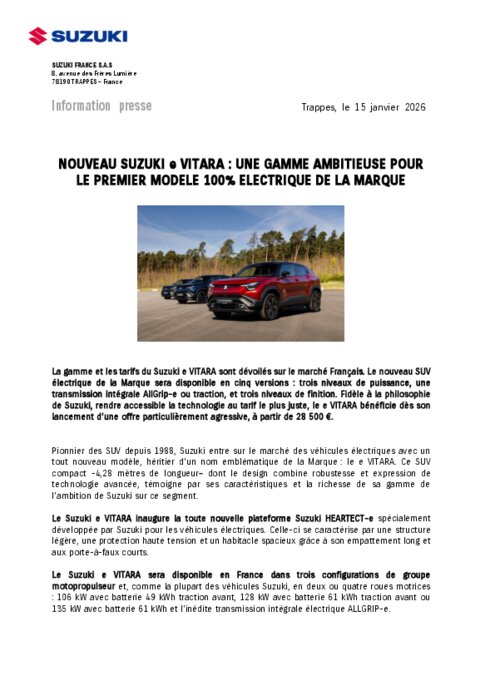 La gamme et les tarifs du Suzuki e VITARA sont dévoilés sur le marché Français. Le nouveau SUV électrique de la Marque sera disponible en cinq versions : trois niveaux de puissance, une transmission intégrale AllGrip-e ou traction, et trois niveaux de finition. Fidèle à la philosophie de Suzuki, rendre accessible la technologie au tarif le plus juste, le e VITARA bénéficie dès son lancement d'une offre particulièrement agressive, à partir de 28 500 €.