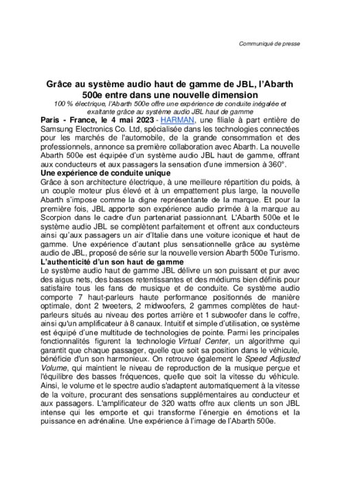 Harman, une filiale à part entière de Samsung Electronics Co. Ltd, spécialisée dans les technologies connectées pour les marchés de l'automobile, de la grande consommation et des professionnels, annonce sa première collaboration avec Abarth. La nouvelle Abarth 500e est équipée d’un système audio JBL haut de gamme, offrant aux conducteurs et aux passagers la sensation d’une immersion à 360°.