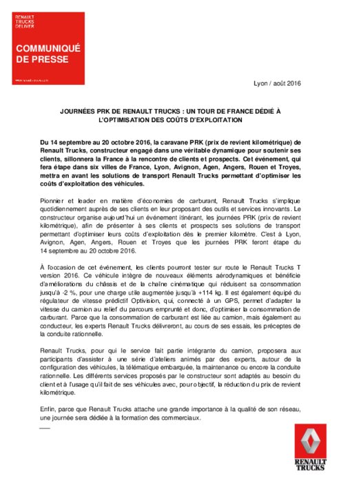 Du 14 septembre au 20 octobre 2016, la caravane PRK (prix de revient kilométrique) de Renault Trucks, constructeur engagé dans une véritable dynamique pour soutenir ses clients, sillonnera la France à la rencontre de clients et prospects. Cet événement, qui fera étape dans six villes de France, Lyon, Avignon, Agen, Angers, Rouen et Troyes, mettra en avant les solutions de transport Renault Trucks permettant d’optimiser les coûts d’exploitation des véhicules.
