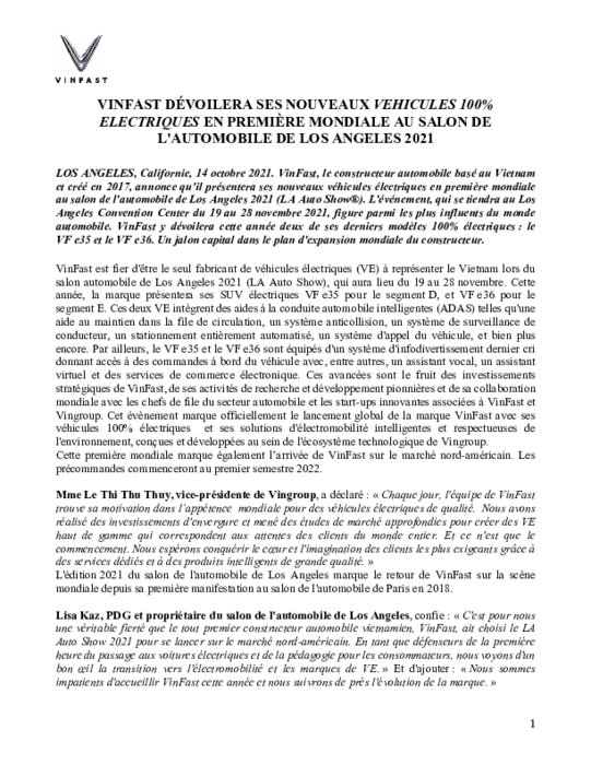 VinFast, le constructeur automobile basé au Vietnam et créé en 2017, annonce qu'il présentera ses nouveaux véhicules électriques en première mondiale au salon de l'automobile de Los Angeles 2021 (LA Auto Show). L'événement, qui se tiendra au Los Angeles Convention Center du 19 au 28 novembre 2021, figure parmi les plus influents du monde automobile. VinFast y dévoilera cette année deux de ses derniers modèles 100% électriques : le VF e35 et le VF e36...
