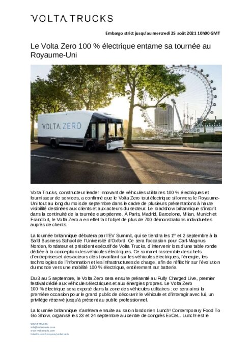 Volta Trucks, constructeur leader innovant de véhicules utilitaires 100 % électriques et fournisseur de services, a confirmé que le Volta Zero tout électrique sillonnera le Royaume-Uni tout au long du mois de septembre dans le cadre de plusieurs présentations à haute visibilité destinées aux clients et aux acteurs du secteur. Le roadshow britannique s’inscrit dans la continuité de la tournée européenne...