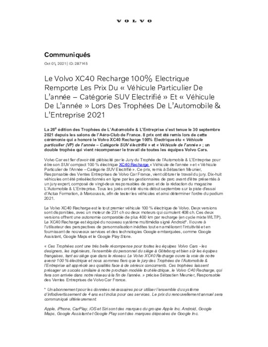La 26e édition des Trophées de L’Automobile & L’Entreprise s’est tenue le 30 septembre 2021 depuis les salons de l’Aéro-Club de France. 8 prix ont été remis lors de cette cérémonie qui a honoré le Volvo XC40 Recharge 100% Electrique élu « Véhicule particulier (VP) de l’année – Catégorie SUV électrifié » et « Véhicule de l’année » ; un double trophée qui vient récompenser le travail de toutes les équipes Volvo Cars.