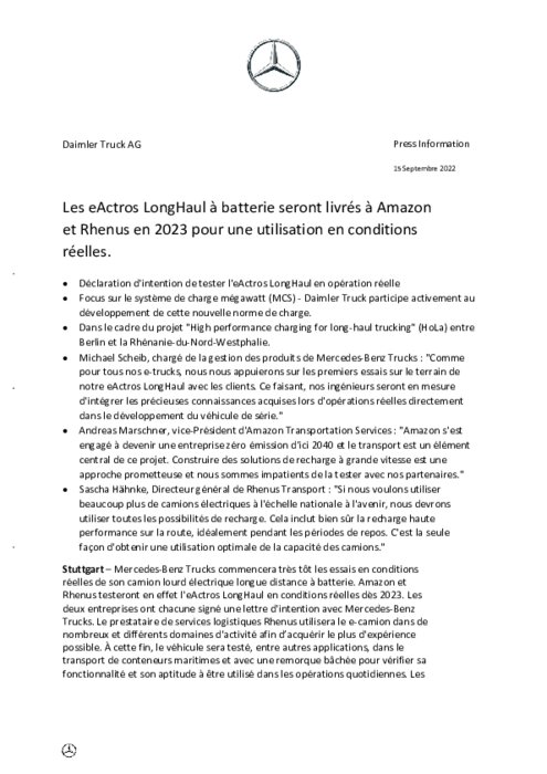 Mercedes-Benz Trucks commencera très tôt les essais en conditions réelles de son camion lourd électrique longue distance à batterie. Amazon et Rhenus testeront en effet l'eActros LongHaul en conditions réelles dès 2023. Les deux entreprises ont chacune signé une lettre d'intention avec Mercedes-Benz Trucks. Le prestataire de services logistiques Rhenus utilisera le e-camion dans de nombreux et différents domaines d'activité afin d’acquérir le plus d'expérience possible.