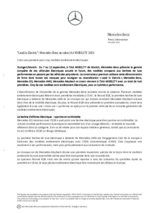 Du 7 au 12 septembre, à l’IAA MOBILITY de Munich, Mercedes-Benz présente la gamme complète de ses véhicules électriques actuels et futurs, des modèles compacts aux berlines de luxe performantes en passant par les véhicules polyvalents. Le constructeur premium utilisera cette démonstration de force dans toutes ses marques pour souligner sa revendication « Lead in Electric »...