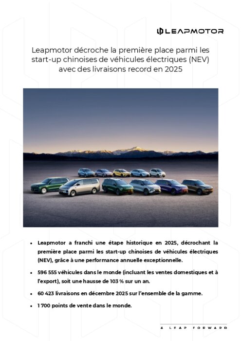 L’entreprise a livré un total de 596555 véhicules dans le monde(incluant les ventes domestiques et à l’export), soit une hausse de 103% sur un an, soulignant sa solidité et sa compétitivité sur le marché. Le mois de décembrea contribué à hauteur de 60423 livraisonssur l’ensemble de la gamme. Cela illustre la croissance rapide de Leapmotor et confirme son leadership dans un secteur en pleine évolution de la mobilité électrique.