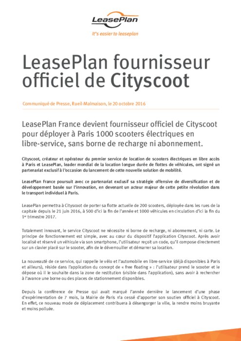 Services 20 octobre 2016 - 11:09 LeasePlan France devient fournisseur offciel de Cityscoot pour déployer à Paris 1000 scooters électriques en libre-service, sans borne de recharge ni abonnement. PDF (551 Ko) Télécharger