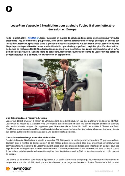 NewMotion, leader européen en matière de solutions de recharge intelligente pour véhicules électriques (VE), et membre du groupe Shell, a été choisi comme partenaire de recharge privilégié en Europe par la société LeasePlan, spécialisée dans la gestion de flottes automobiles. Ce partenariat avec LeasePlan est une étape importante pour NewMotion qui soutient l'ambition globale du groupe Shell : exploiter plus d'un demi-million de bornes de recharge d'ici 2025 à destination des entreprises...