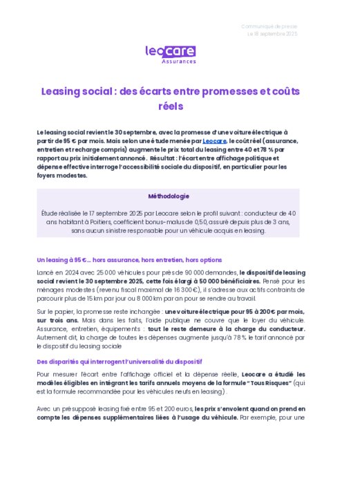 Le leasing social revient le 30 septembre, avec la promesse d’une voiture électrique à partir de 95€ par mois. Mais selon une étude menée par Leocare, le coût réel (assurance, entretien et recharge compris) augmente le prix total du leasing entre 40 et 78 % par rapport au prix initialement annoncé. Résultat : l’écart entre affichage politique et dépense effective interroge l’accessibilité sociale du dispositif, en particulier pour les foyers modestes.