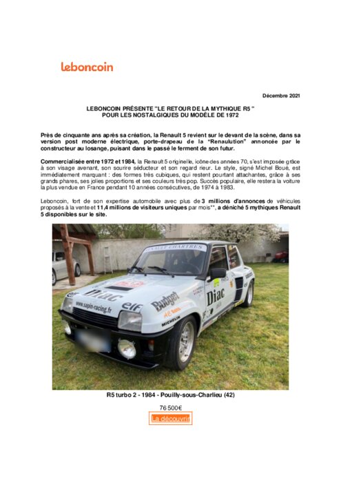 Constructeurs 21 décembre 2021 - 12:01 Leboncoin, fort de son expertise automobile avec plus de 3 millions d'annonces de véhicules proposés à la vente et 11,4 millions de visiteurs uniques par mois**, a déniché 5 mythiques Renault 5 disponibles sur le site. PDF (480 Ko) Télécharger