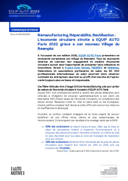A l’occasion de son édition 2022, EQUIP AUTO Paris présentera en exclusivité européenne son Village du Réemploi. Tous les exposants désireux de valoriser leur engagement en matière d’économie circulaire auront ainsi l’opportunité de présenter leurs initiatives et innovations.