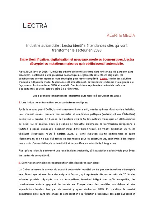 L’industrie automobile mondiale entre dans une phase de transition sans précédent. Confrontés à des pressions économiques, réglementaires et technologiques, les constructeurs doivent repenser leurs stratégies pour rester compétitifs. Lectra, leader des solutions d’industrie 4.0 pour la mode, l’automobile et l’ameublement, dévoile les 5 tendances stratégiques qui façonneront l’automobile en 2026 et au-delà. Ces évolutions représentent autant de défis que d’opportunités pour les acteurs prêts à se réinventer.