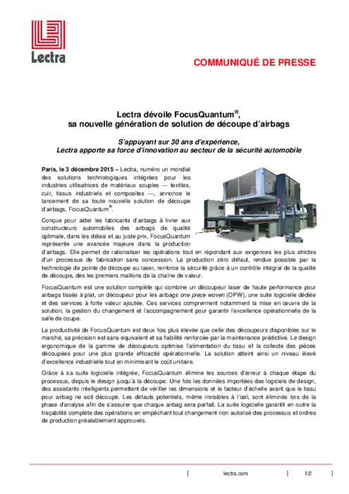 Lectra, numéro un mondial des solutions technologiques intégrées pour les industries utilisatrices de matériaux souples — textiles, cuir, tissus industriels et composites —, annonce le lancement de sa toute nouvelle solution de découpe d’airbags, FocusQuantum.
