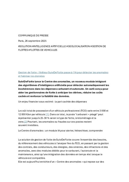 SuiviDeFlotte lance le Centre des anomalies, un nouveau module intégrant des algorithmes d’intelligence artificielle pour détecter automatiquement les incohérences dans les dépenses carburant et autoroute. Un outil conçu pour aider les gestionnaires de flotte à anticiper les dérives, réduire les coûts cachés et renforcer la fiabilité des données.
