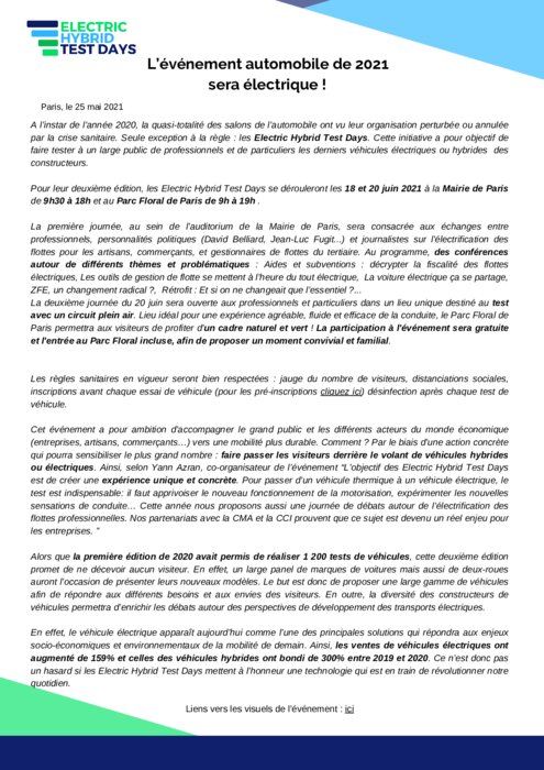 Selon une récente étude de Nissan, 70% des Européens envisagent d'acheter un véhicule l'an prochain. Désormais, les automobilistes considèrent donc l'électrique avec un réel intérêt. Dans ce contexte, les Electric Hybrid Test Days ont pour objectif de faire tester à un large public de professionnels et de particuliers les derniers véhicules hybrides ou électriques des constructeurs. L'événement se déroulera le 18 juin à la mairie de Paris et le 20 juin au Parc Floral de Paris.