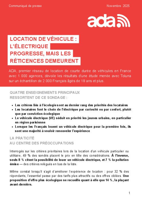 ADA, premier réseau de location de courte durée de véhicules en France avec 1000 agences, dévoile les résultats d’une étude menée avec Toluna sur un échantillon de 2 000 Français âgés de 18 ans et plus. Dans celle-ci, les sondés étaient notamment interrogés sur leur rapport au véhicule électrique.