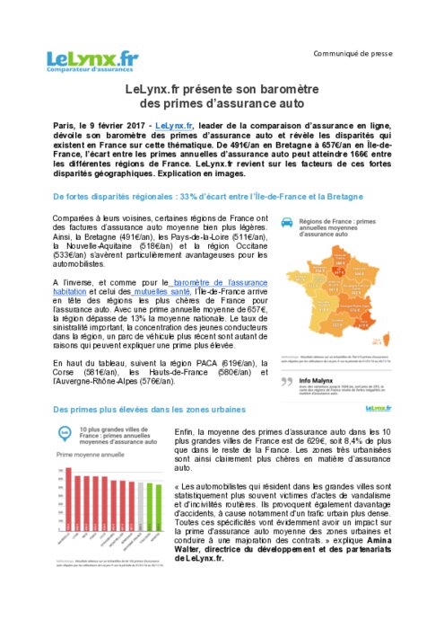LeLynx.fr, leader de la comparaison d’assurance en ligne, dévoile son baromètre des primes d’assurance auto et révèle les disparités qui existent en France sur cette thématique. De 491€/an en Bretagne à 657€/an en Île-de-France, l’écart entre les primes annuelles d’assurance auto peut atteindre 166€ entre les différentes régions de France. LeLynx.fr revient sur les facteurs de ces fortes disparités géographiques.