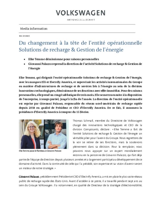 Elke Temme, qui dirigeait l’entité opérationnelle Solutions de recharge & Gestion de l’énergie, avec les marques Elli et Electrify America, et supervisait les activités internationales du Groupe en matière d'infrastructures de recharge et de services liés à l’énergie au sein de la division Innovations technologiques, démissionne de ses fonctions avec effet immédiat. Pour des raisons personnelles, elle prend un congé sabbatique de trois mois.