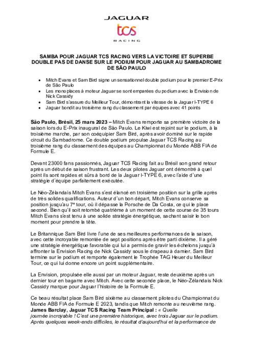 Mitch Evans remporte sa première victoire de la saison lors du E-Prix inaugural de São Paulo. Le Kiwi est rejoint sur le podium, à la troisième marche, par son coéquipier Sam Bird, après avoir dominé sur le rapide circuit du Sambadrome. Ce double podium propulse Jaguar TCS Racing au troisième rang du classement des équipes au Championnat du Monde ABB FIA de Formule E;